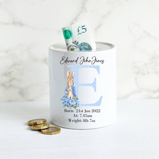 Personalised Blue Rabbit money box, new baby boy gift