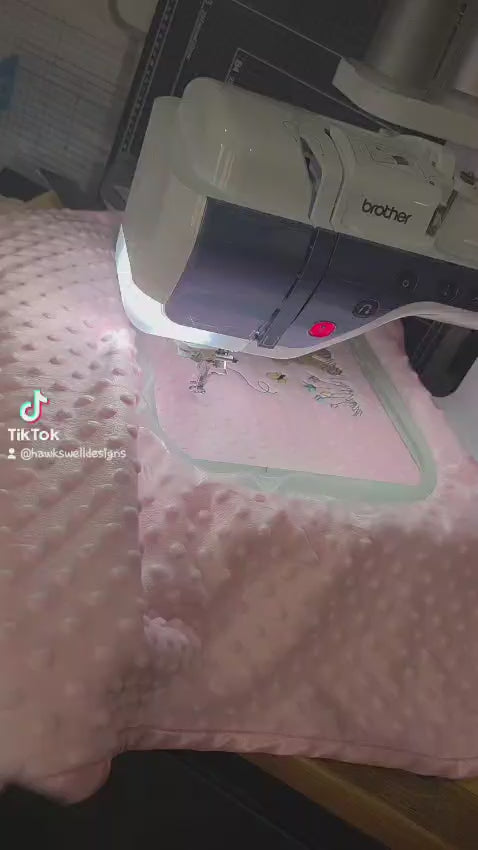 Wrap your little one in comfort and sweetness with this beautifully embroidered personalised minky baby blanket. The soft pink minky dot fabric is gentle on delicate skin and features an adorable stitched design of a cheerful bear surrounded by butterflies and spring flowers. The blanket is customized with your baby’s name in elegant embroidery, making it a meaningful keepsake for years to come.